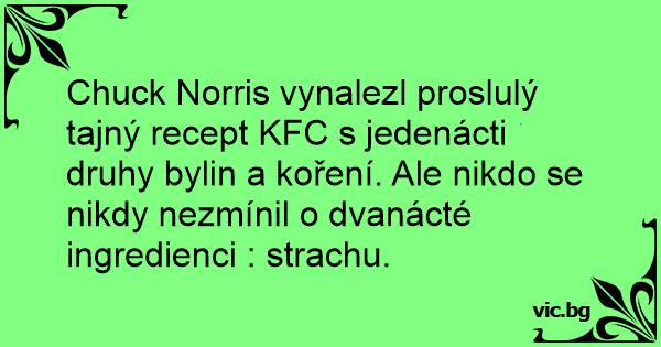 Chuck Norris vynalezl proslulý tajný recept KFC s jedenácti druhy bylin a koření. Ale nikdo se nikdy nezmínil o dvanácté ingredienci : strachu.
