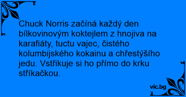 Chuck Norris začíná každý den bílkovinovým koktejlem z hnojiva na karafiáty, tuctu vajec, čistého kolumbijského kokainu a chřestýšího jedu. Vstřikuje si hо přímo do krku stříkačkou.