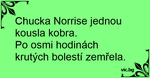 Кобра Питат Чък Норис-Вярно ли е, че ви е ухапала кралска кобра? Once a cobra bit Chuck Norris. After 5 days of extreme pain... the snake died. Chuck Norris was bitten by a cobra, cobra died after 5 days. Chuck Norris wurde von einer Königs Kobra gebissen. Nach 5 qualvollen Tagen starb die Kobra. Chuck Norris wurde einmal von einer Kobra gebissen. Nach 5 quälenden Tagen voller Schmerzen ist die Kobra gestorben. Un jour Chuck Norris s'est fait mordre par un cobra. Après plusieurs jours d'atroces souffrances, le serpent est mort. Un jour un cobra à osé mordre Chuck Norris. Après 12 jours de douleur atroce, le cobra est mort. O data,o cobra la muscat pe Chuck Norris si dupa 3 zile de chinuri cobra a murit. Chucka Norrise jednou kousla anakonda. Pět dní na to zemřela na otravu krve.