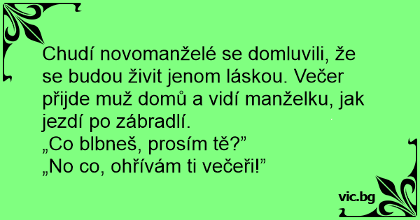 Chudí novomanželé se domluvili, že se budou živit jenom láskou. Večer přijde muž domů a vidí manželku, jak jezdí po zábradlí.