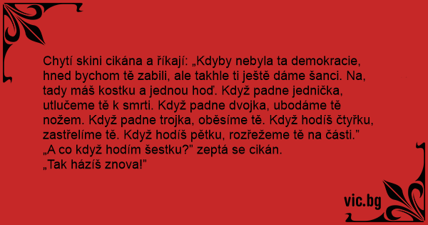 Chytí skini cikána a říkají: „Kdyby nebyla ta demokracie, hned bychom tě zabili, ale takhle ti ještě dáme šanci. Na, tady máš kostku a jednou hoď. Když padne jednička, utlučeme tě k smrti. Když padne dvojka, ubodáme tě nožem. Když padne trojka, oběsíme tě. Když hodíš čtyřku, zastřelíme tě. Když hodíš pětku, rozřežeme tě na části.”