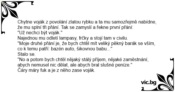 Chytne voják z povolání zlatou rybku a ta mu samozřejmě nabídne, že mu splní tři přání. Tak se zamyslí a řekne první přání: