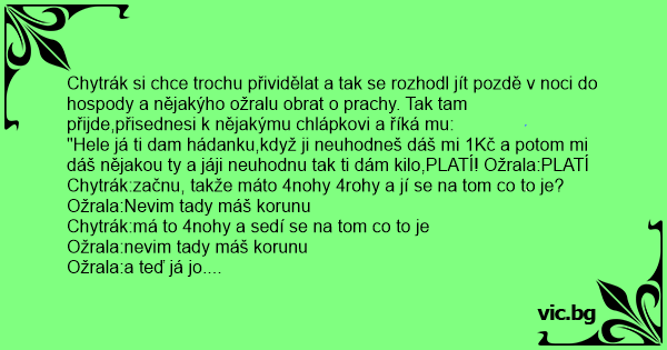 Chytrák si chce trochu přividělat a tak se rozhodl jít pozdě v noci do hospody a nějakýho ožralu obrat o prachy. Tak tam přijde,přisednesi k nějakýmu chlápkovi a říká mu: