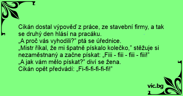 „Mistr říkal, že mi špatně pískalo kolečko,” stěžuje si nezaměstnaný a začne pískat: „Fiii - fiii - fiii - fiii!”