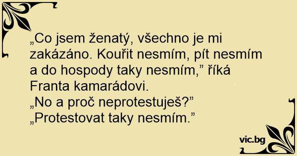 „Co jsem ženatý, všechno je mi zakázáno. Kouřit nesmím, pít nesmím a do hospody taky nesmím,” říká Franta kamarádovi.