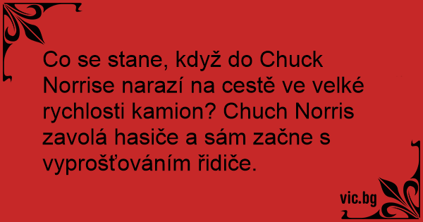 Co se stane, když do Chuck Norrise narazí na cestě ve velké rychlosti kamion? Chuch Norris zavolá hasiče a sám začne s vyprošťováním řidiče.