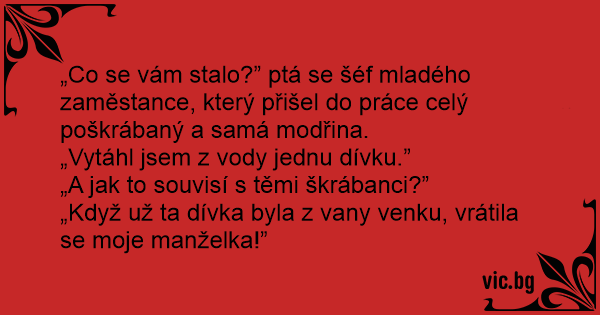 „Co se vám stalo?” ptá se šéf mladého zaměstance, který přišel do práce celý poškrábaný a samá modřina.