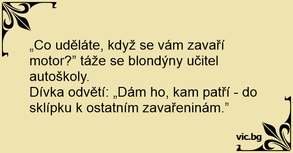 „Co uděláte, když se vám zavaří motor?” táže se blondýny učitel autoškoly.