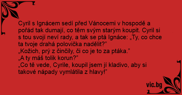 Cyril s Ignácem sedí před Vánocemi v hospodě a pořád tak dumají, co těm svým starým koupit. Cyril si s tou svojí neví rady, a tak se ptá Ignáce: „Ty, co chce ta tvoje drahá polovička nadělit?”