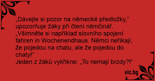 „Dávejte si pozor na německé předložky,” upozorňuje žáky při čtení němčinář. „Všimněte si například slovního spojení fahren in Wochenendhaus. Němci neříkají, že pojedou na chatu, ale že pojedou do chaty!”