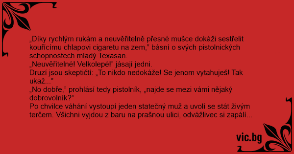 „No dobře,” prohlásí tedy pistolník, „najde se mezi vámi nějaký dobrovolník?”