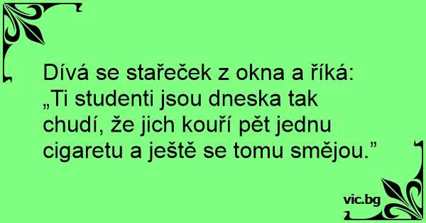 Dívá se stařeček z okna a říká: „Ti studenti jsou dneska tak chudí, že jich kouří pět jednu cigaretu a ještě se tomu smějou.”