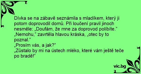 Dívka se na zábavě seznámila s mladíkem, který ji potom doprovodil domů. Při loučení pravil jinoch nesměle: „Doufám, že mne za doprovod políbíte.”
