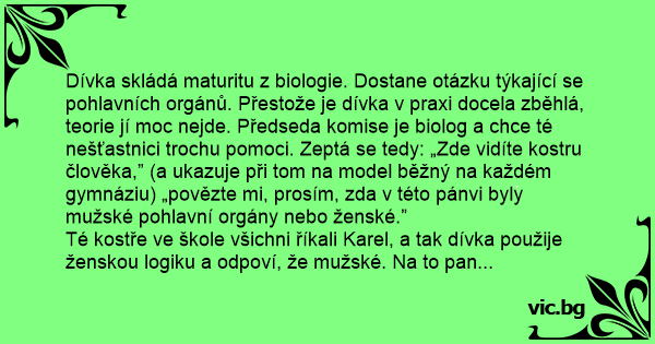 Dívka skládá maturitu z biologie. Dostane otázku týkající se pohlavních orgánů. Přestože je dívka v praxi docela zběhlá, teorie jí moc nejde. Předseda komise je biolog a chce té nešťastnici trochu pomoci. Zeptá se tedy: „Zde vidíte kostru člověka,” (a ukazuje při tom na model běžný na každém gymnáziu) „povězte mi, prosím, zda v této pánvi byly mužské pohlavní orgány nebo ženské.”