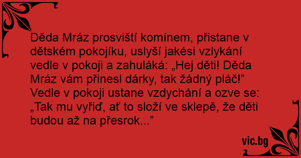 Děda Mráz prosviští komínem, přistane v dětském pokojíku, uslyší jakési vzlykání vedle v pokoji a zahuláká: „Hej děti! Děda Mráz vám přinesl dárky, tak žádný pláč!”
