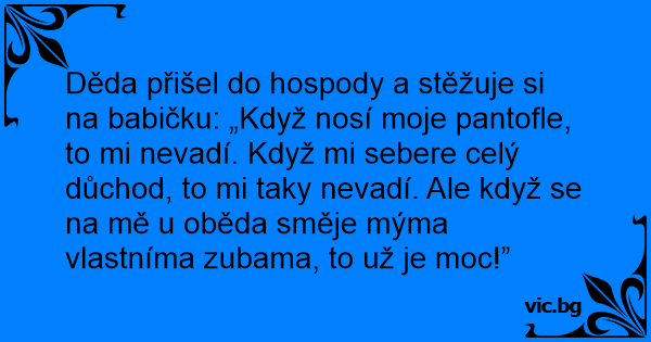 Děda přišel do hospody a stěžuje si na babičku: „Když nosí moje pantofle, to mi nevadí. Když mi sebere celý důchod, to mi taky nevadí. Ale když se na mě u oběda směje mýma vlastníma zubama, to už je moc!”
