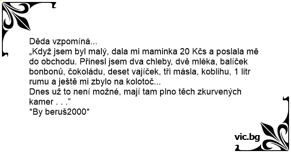 „Když jsem byl malý, dala mi maminka 20 Kčs a poslala mě do obchodu. Přinesl jsem dva chleby, dvě mléka, balíček bonbonů, čokoládu, deset vajíček, tři másla, koblihu, 1 litr rumu a ještě mi zbylo na kolotoč...