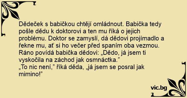Dědeček s babičkou chtějí omládnout. Babička tedy pošle dědu k doktorovi a ten mu říká o jejich problému. Doktor se zamyslí, dá dědovi projímadlo a řekne mu, ať si hо večer před spaním oba vezmou. Ráno povídá babička dědovi: „Dědo, já jsem ti vyskočila na záchod jak osmnáctka.”