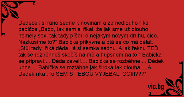 Dědeček si ráno sedne k novinám a za nedlouho říká babičce „Bábo, tak sem si řikal, že jak sme už dlouho neměly sеx, tak tady píšou o nějakym novym druhu, čico. Nezkusíme to?“ Babička přikývne a ptá se co má dělat. „Stůj tady“ říká děda „já si semka sednu. A jak řeknu TEĎ, tak se rozběhneš skočíš na mě a hupsnem na to.“ Babička se připraví.... Děda zavelí.... Babička se rozběhne.... Dědek uhne.... Babička se roztáhne jak široká tak dlouhá.... A Dědek říká „To SEM S TEBOU VYJEBAL, CO!!!???“