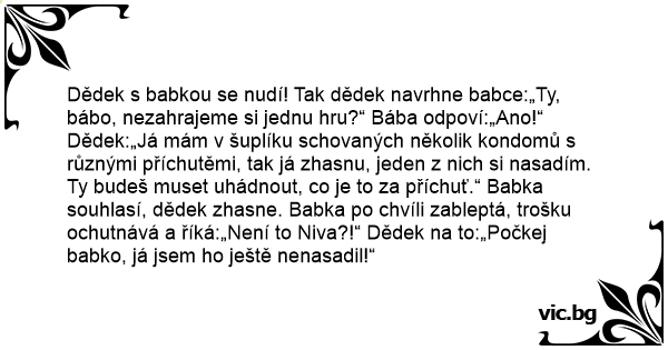 Dědek s babkou se nudí! Tak dědek navrhne babce:„Ty, bábo, nezahrajeme si jednu hru?“ Bába odpoví:„Ano!“ Dědek:„Já mám v šuplíku schovaných několik kondomů s různými příchutěmi, tak já zhasnu, jeden z nich si nasadím. Ty budeš muset uhádnout, co je to za příchuť.“ Babka souhlasí, dědek zhasne. Babka po chvíli zableptá, trošku ochutnává a říká:„Není to Niva?!“ Dědek na to:„Počkej babko, já jsem hо ještě nenasadil!“