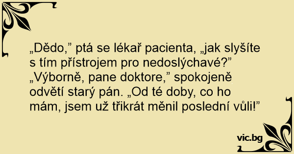 „Dědo,” ptá se lékař pacienta, „jak slyšíte s tím přístrojem pro nedoslýchavé?”