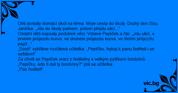 Ostatní děti napsaly podobné věci. Vstane Pepíček a čte: „Jdu ulicí, v prvním průjezdu kurva, ve druhém průjezdu kurva, ve třetím průjezdu pajzl...”