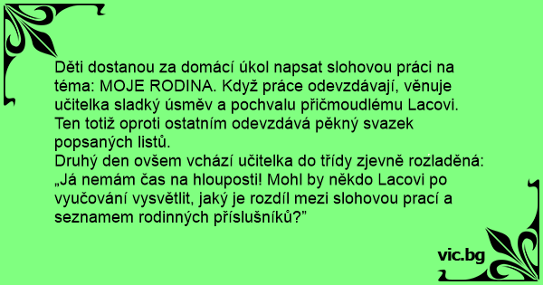 Druhý den ovšem vchází učitelka do třídy zjevně rozladěná: „Já nemám čas na hlouposti! Mohl by někdo Lacovi po vyučování vysvětlit, jaký je rozdíl mezi slohovou prací a seznamem rodinných příslušníků?”