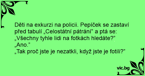 Děti na exkurzi na policii. Pepíček se zastaví před tabulí „Celostátní pátrání” a ptá se: „Všechny tyhle lidi na fotkách hledáte?”