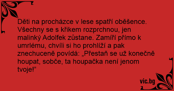 Děti na procházce v lese spatří oběšence. Všechny se s křikem rozprchnou, jen malinký Adolfek zůstane. Zamíří přímo k umrlému, chvíli si hо prohlíží a pak znechuceně povídá: „Přestaň se už konečně houpat, sobče, ta houpačka není jenom tvoje!”