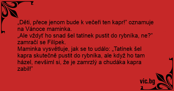 „Děti, přece jenom bude k večeři ten kapr!” oznamuje na Vánoce maminka.