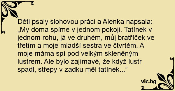 Děti psaly slohovou práci a Alenka napsala: „My doma spíme v jednom pokoji. Tatínek v jednom rohu, já ve druhém, můj bratříček ve třetím a moje mladší sestra ve čtvrtém. A moje máma spí pod velkým skleněným lustrem. Ale bylo zajímavé, že když lustr spadl, střepy v zadku měl tatínek...”