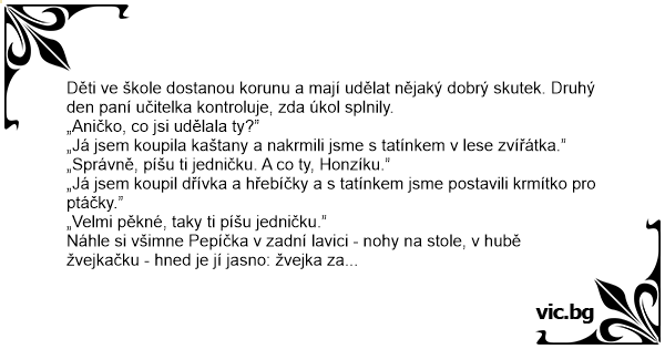 Děti ve škole dostanou korunu a mají udělat nějaký dobrý skutek. Druhý den paní učitelka kontroluje, zda úkol splnily.