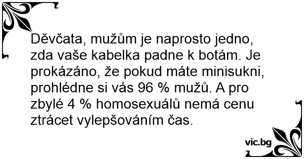 Děvčata, mužům je naprosto jedno, zda vaše kabelka padne k botám. Je prokázáno, že pokud máte minisukni, prohlédne si vás 96 % mužů. A pro zbylé 4 % homosexuálů nemá cenu ztrácet vylepšováním čas.