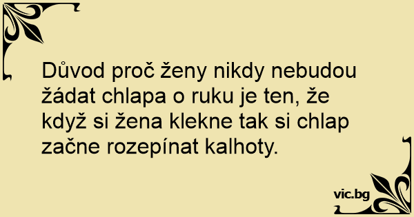 Důvod proč ženy nikdy nebudou žádat chlapa o ruku je ten, že když si žena klekne tak si chlap začne rozepínat kalhoty.
