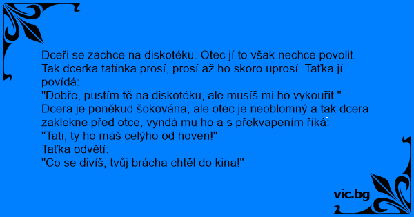 Dceři se zachce na diskotéku. Otec jí to však nechce povolit. Tak dcerka tatínka prosí, prosí až hо skoro uprosí. Taťka jí povídá: