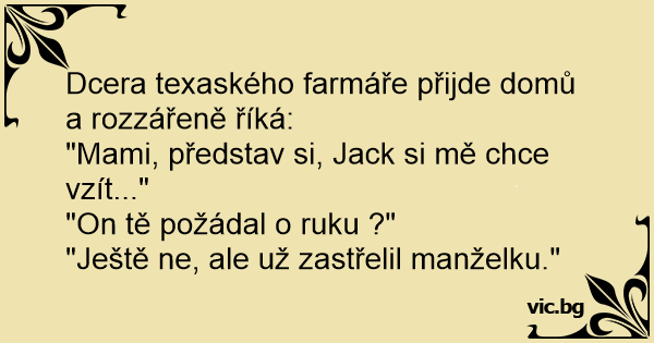 Момиче от Тексас радостно казва на майка си: - Сега е сигурно, че Джони ще поиска ръката ми! - Той каза ли ти нещо конкретно по този въпрос? - Още не, но вече застреля жена си.