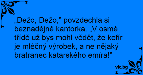 „Dežo, Dežo,” povzdechla si beznadějně kantorka. „V osmé třídě už bys mohl vědět, že kefír je mléčný výrobek, a ne nějaký bratranec katarského emíra!”