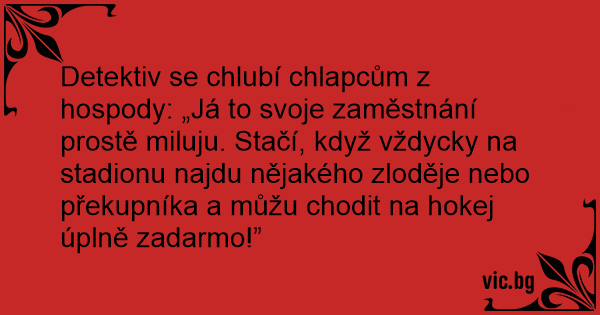 Detektiv se chlubí chlapcům z hospody: „Já to svoje zaměstnání prostě miluju. Stačí, když vždycky na stadionu najdu nějakého zloděje nebo překupníka a můžu chodit na hokej úplně zadarmo!”