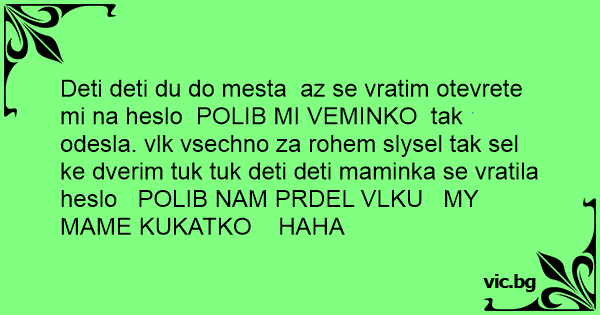 Deti deti du do mesta az se vratim otevrete mi na heslo POLIB MI VEMINKO tak odesla. vlk vsechno za rohem slysel tak sel ke dverim tuk tuk deti deti maminka se vratila heslo POLIB NAM PRDEL VLKU MY MAME KUKATKO HAHA