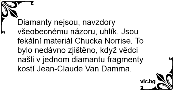 Diamanty nejsou, navzdory všeobecnému názoru, uhlík. Jsou fekální materiál Chucka Norrise. To bylo nedávno zjištěno, když vědci našli v jednom diamantu fragmenty kostí Jean-Claude Van Damma.