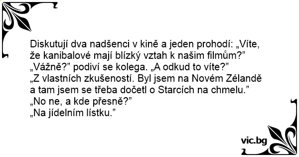 Diskutují dva nadšenci v kině a jeden prohodí: „Víte, že kanibalové mají blízký vztah k našim filmům?”