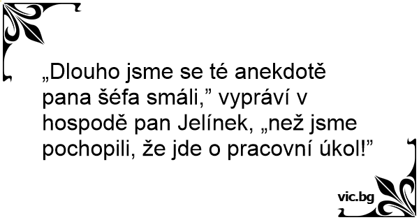 „Dlouho jsme se té anekdotě pana šéfa smáli,” vypráví v hospodě pan Jelínek, „než jsme pochopili, že jde o pracovní úkol!”