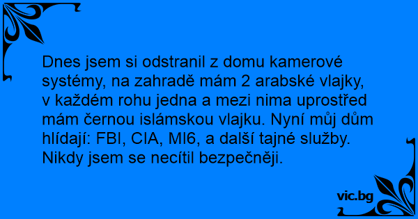 Dnes jsem si odstranil z domu kamerové systémy, na zahradě mám 2 arabské vlajky, v každém rohu jedna a mezi nima uprostřed mám černou islámskou vlajku. Nyní můj dům hlídají: FBI, CIA, MI6, a další tajné služby. Nikdy jsem se necítil bezpečněji.