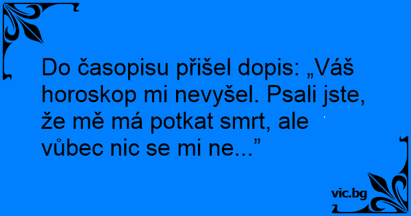 Do časopisu přišel dopis: „Váš horoskop mi nevyšel. Psali jste, že mě má potkat smrt, ale vůbec nic se mi ne...”