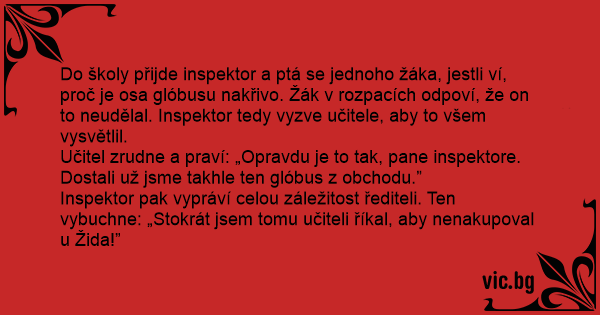 Inspektor pak vypráví celou záležitost řediteli. Ten vybuchne: „Stokrát jsem tomu učiteli říkal, aby nenakupoval u Žida!”