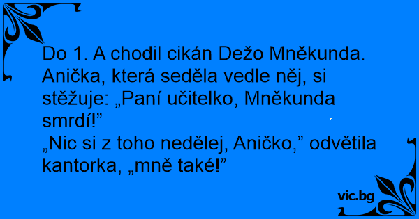 Do 1. A chodil cikán Dežo Mněkunda. Anička, která seděla vedle něj, si stěžuje: „Paní učitelko, Mněkunda smrdí!”