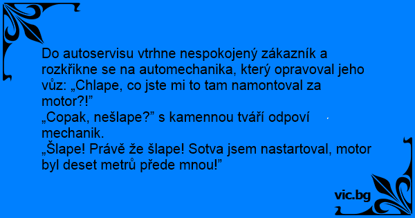 „Copak, nešlape?” s kamennou tváří odpoví mechanik.