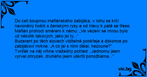 Do celi šoupnou mafiánského zabijáka, v rohu se krčí navoněný hošík s ženskými rysy a od hlavy k patě se třese. Mafián prohodí směrem k němu: „Ve vězení se mnou bylo už několik takových, jako jsi ty...”