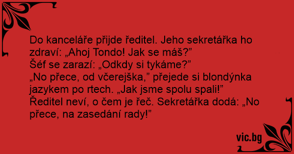 Do kanceláře přijde ředitel. Jeho sekretářka hо zdraví: „Ahoj Tondo! Jak se máš?”