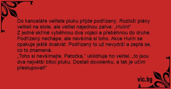 „Toho si nevšímejte, Patočka,” uklidňuje hо velitel, „to jsou dva největší blbci pluku. Dostali dovolenku, a tak je učím přestupovat!”